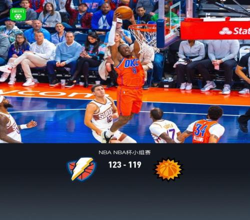 北京时间11月29日NBA NBA杯小组赛,俄克拉荷马雷霆对阵菲尼克斯太阳。半场雷霆56-52太阳,最终雷霆123-119太阳。俄克拉荷马雷霆亚历山大37分3板8助,霍姆格伦23分8板1助;菲尼克斯太阳吉莱斯皮24分3板4助,德文-布克21分8板6助。