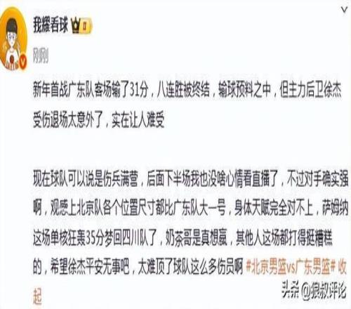 博主“我耀说球”发文点评:新年首战广东队客场输了31分,八连胜被终结,输球预料之中,但主力后卫徐杰受伤退场太意外了,实在让人难受。