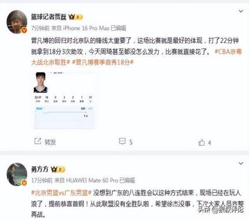 篮球记者贾磊发文点评:“曾凡博的回归对北京队的锋线太重要了,这场比赛就是最好的体现,打了22分钟就拿到18分3次助攻,今天周琦甚至都没怎么发力,比赛就直接花了。”