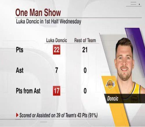 值得一提的是,湖人上半场得到的43分,其中有39分来自东契奇直接得分,或者东契奇助攻得分,折射出东契奇之于湖人的重要性。